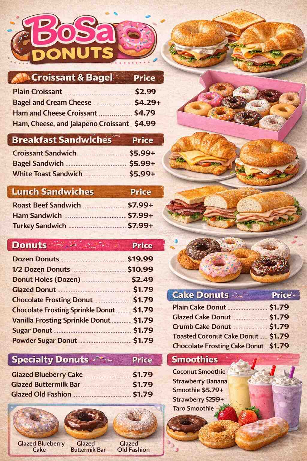 This guide gives you a complete overview of the BoSa Donuts menu, including specialty donuts, donut holes, hearty lunch sandwiches, smoothies, and more. Below, you’ll find updated menu items and prices so you can plan your perfect box of treats with confidence.